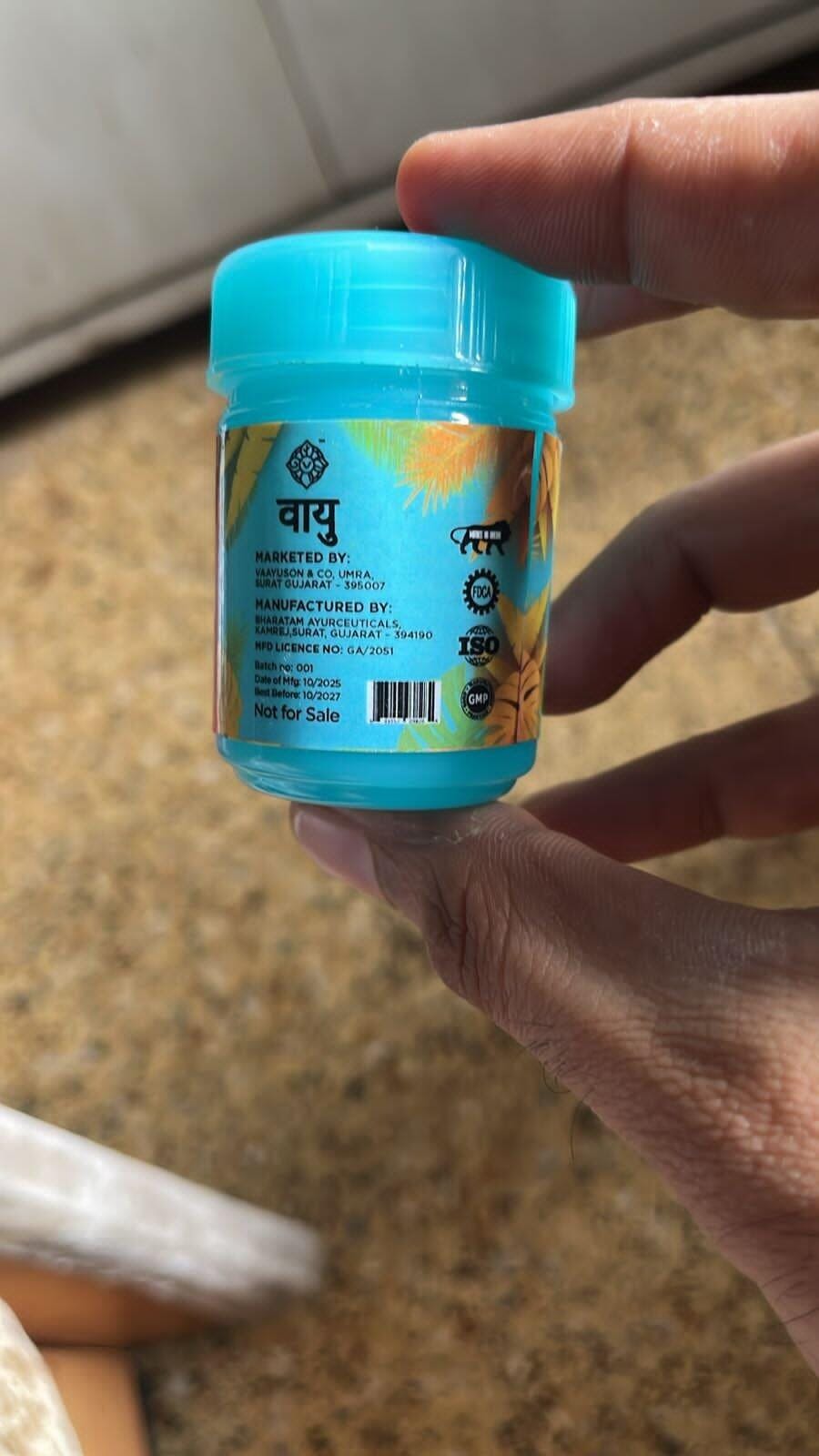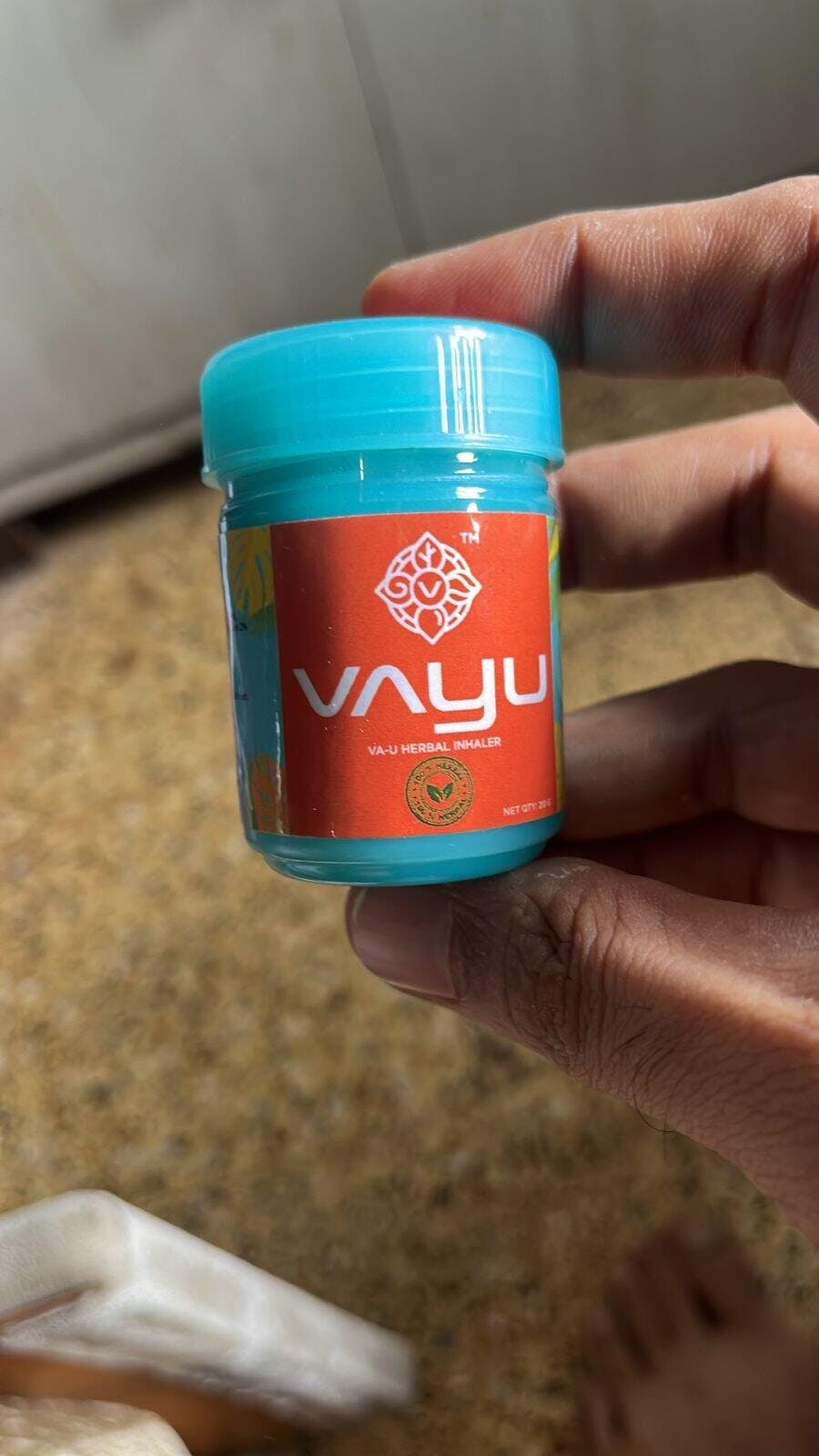 The Vayu Herbal Inhaler is made from a blend of natural herbs and essential oils such as eucalyptus (नीलगिरी), peppermint (पुदीना), thyme (अजवायन पत्ती), licorice (मुलेठी), and menthol (मेन्थॉल).
